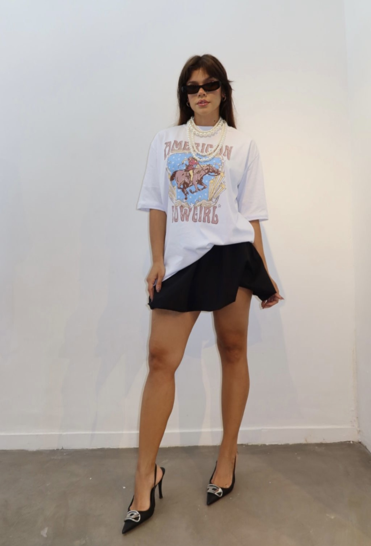 Camisa oversized com estampa American girl, tendência 2024.